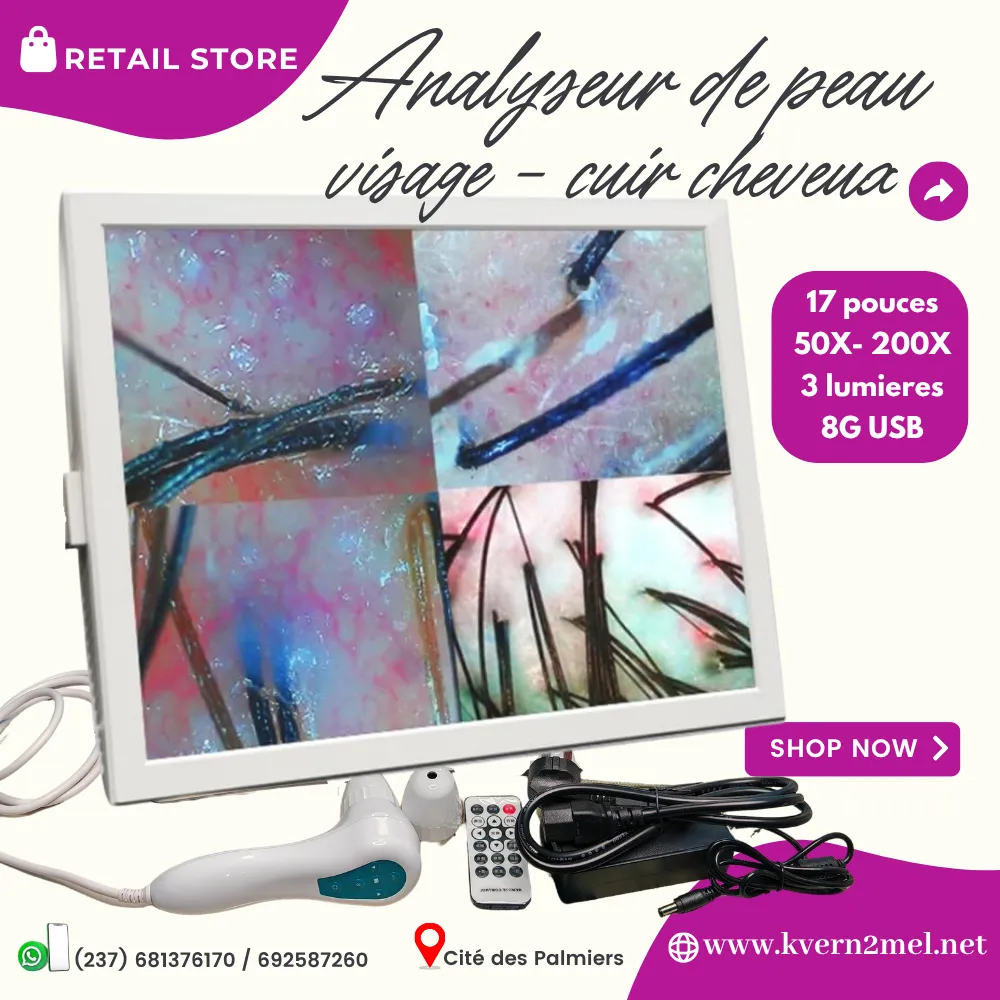 Analyseur de peau et cheveux avec écran LCD de 17 pouces, comprend 2 lentilles (50X et 200X) et 3 lumieres (blanche, UV, polarisée) pour la détection de differents problemes sur les differentes surface de la peau