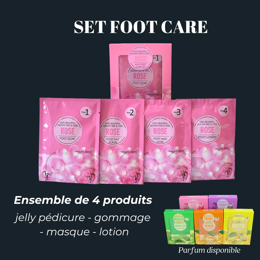 Le Set foot care est composé de 4 produits: jelly pédicure – gommage – masque – lotion