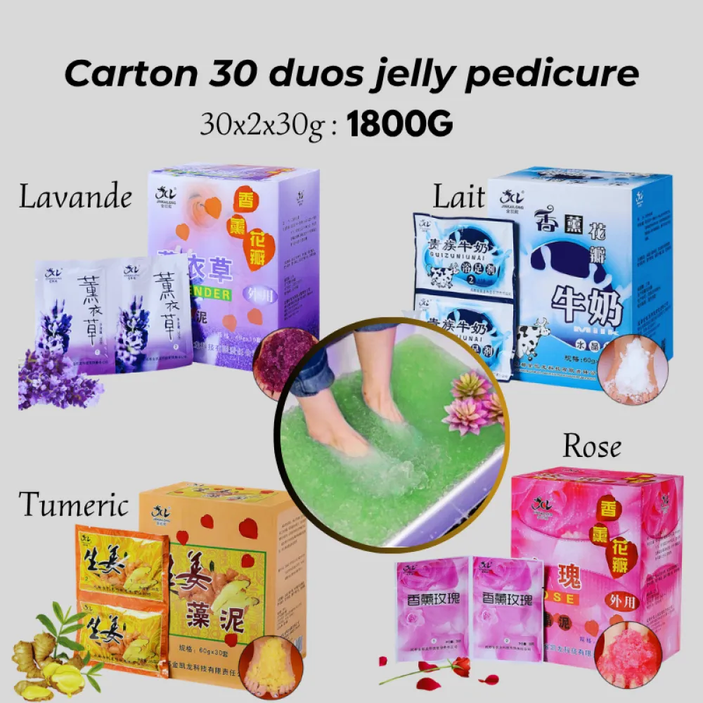 Le Jelly pedicure se vend et s’utilise en duo (step 1 – step 2) : le step 1 sert à créer la gélée et le step 2 la fait dissoudre