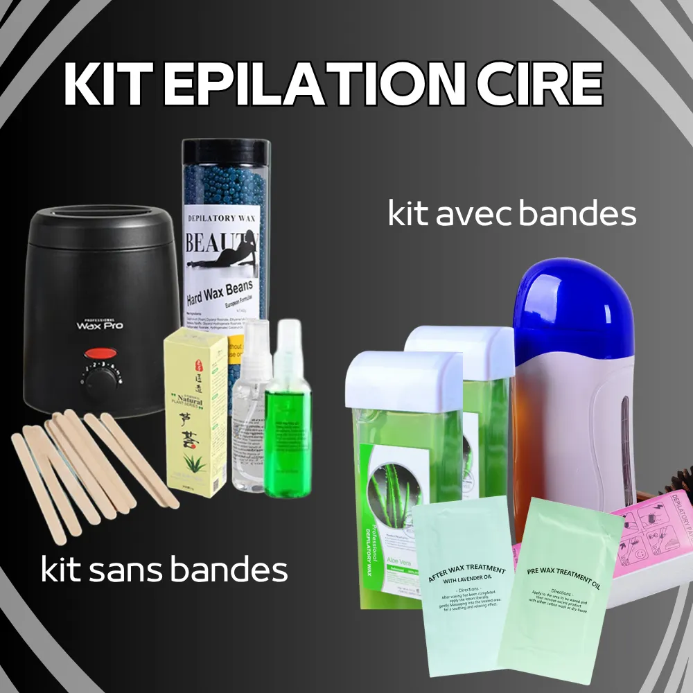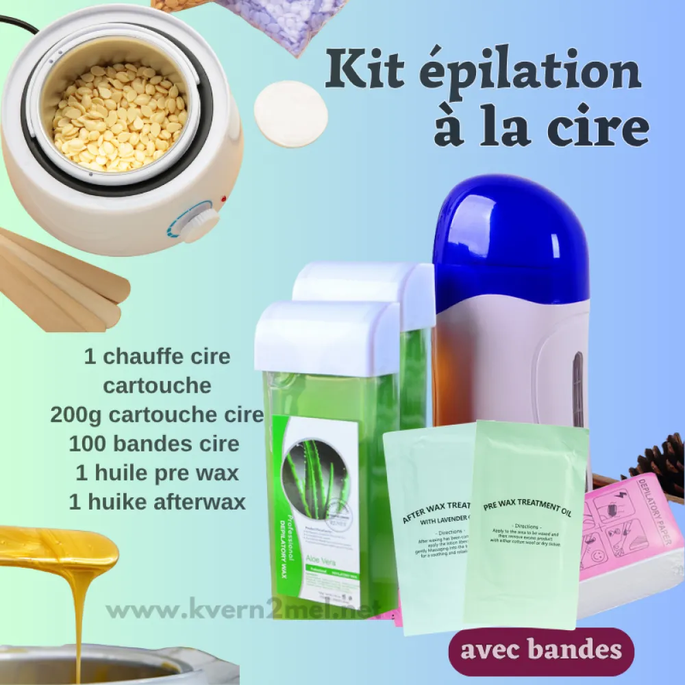 KIT AVEC BANDES : 1 chauffe cire en cartouche – 2 cartouche 100G cire – 100 bandes cire – 1 huile prewax – 1 huile afterwax