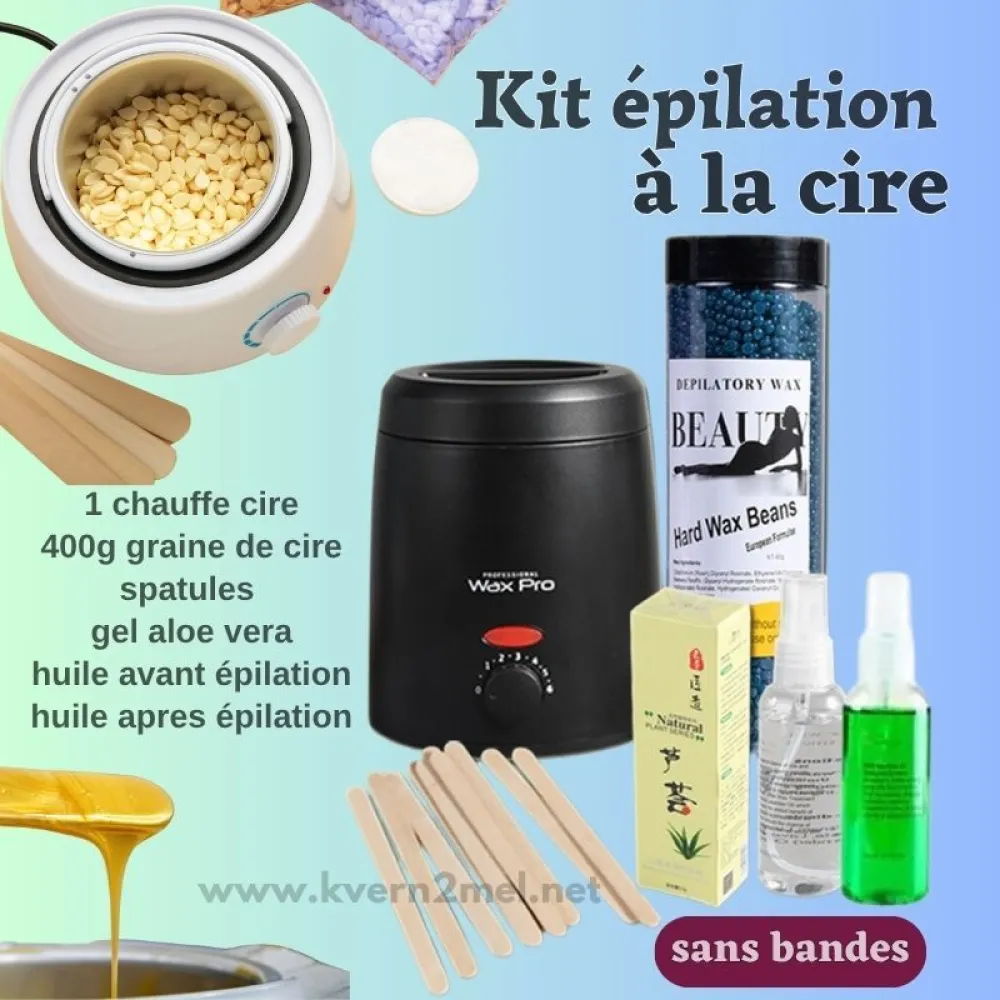 KIT SANS BANDES : 1 chauffe cire – 400g de graines de cire (au choix) – 10 batonnets pour nez ou oreilles – 30 spatules larges – 30ml d’huile after wax – 30ml huile pre wax – 50ml gel apaisant