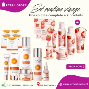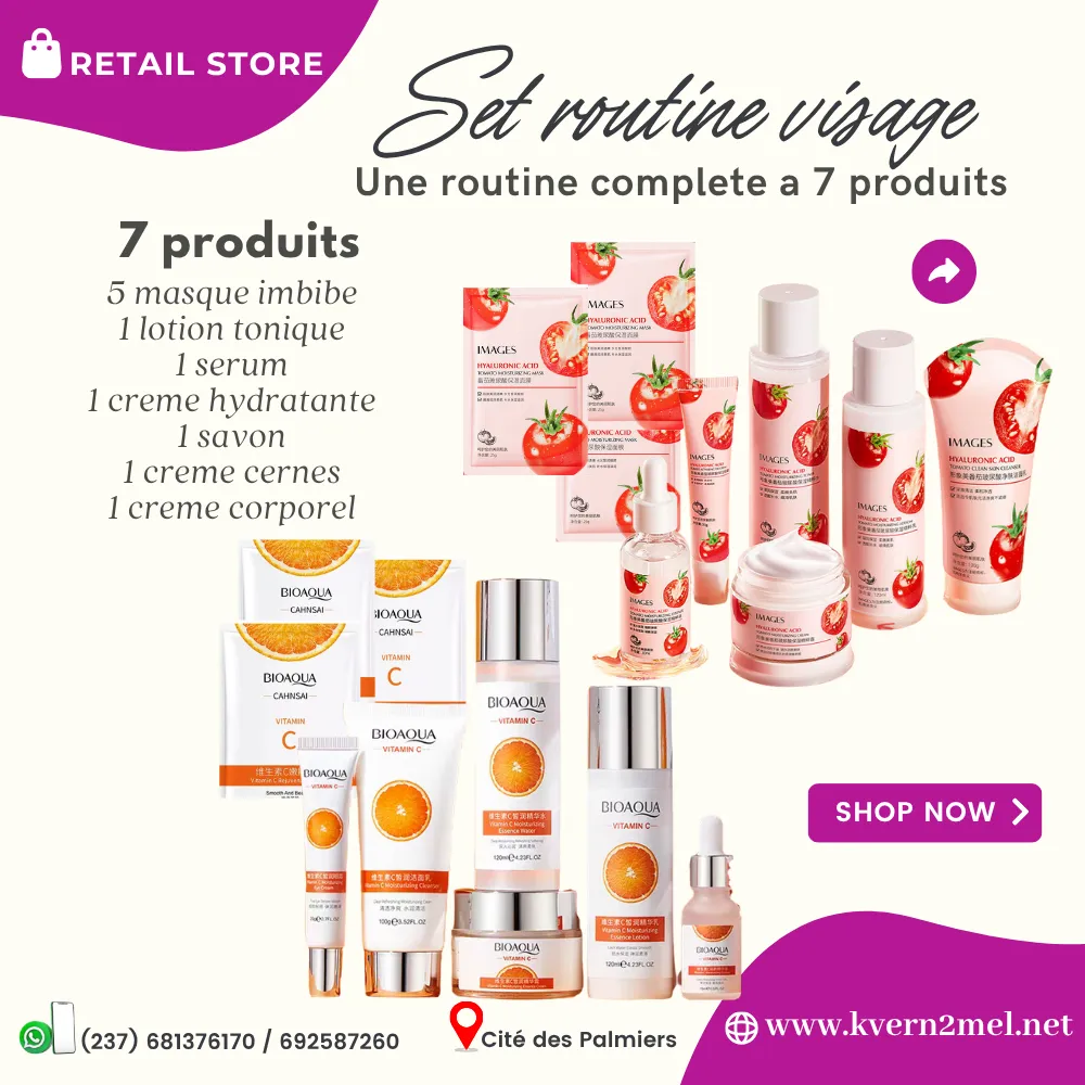 Produits de soin pour routine complete visage à base de divers ingrédients qui vont hydrater la peau, agir sur les taches d’hyperpigmentationapporter de l'eclat et ralentir les signes de vieillissement de la peau.