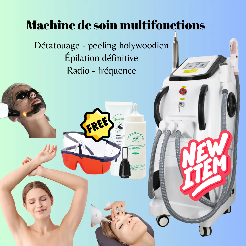 Le laser multifonctions quant à elle combine en une seule 3 manches : épilation définitive au laser, laser pour détatouage et peeling hollywoodien et celui de la radiofréquence. La machine est fournie avec plusieurs têtes de rechange, gel ultrasons, gel au carbone et 1 paire de lunettes de protection laser et guide d’utilisation pratique.
