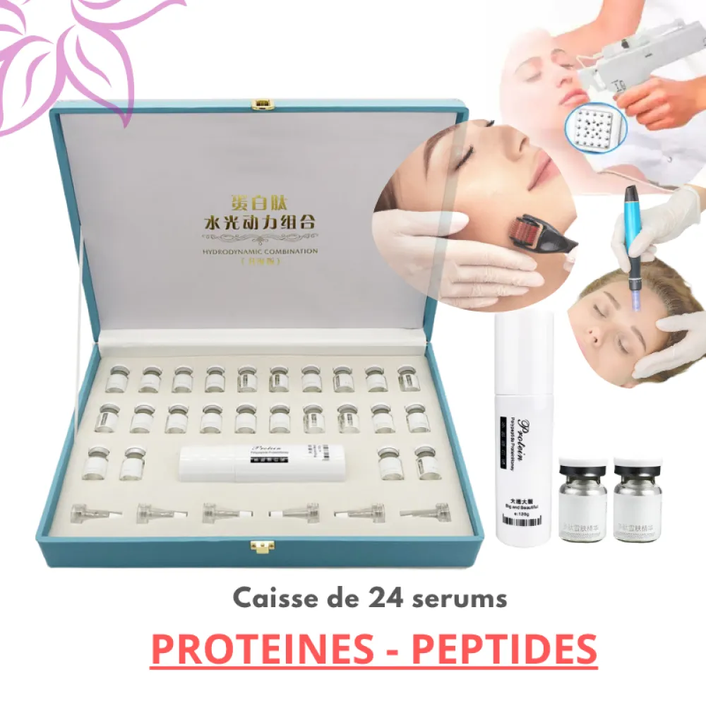 La caisse de sérum de protéines permet une hydratation profonde de la peau tout en restaurant sa fermete. Les peptides vont lisser la peau, améliorer son élasticité et réparer l’épiderme (éfficace pour combattre les vergetures et rles signes de l'age).